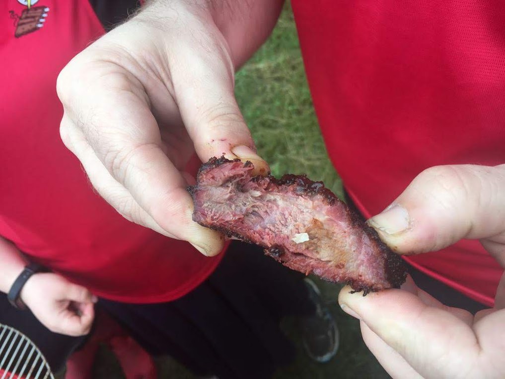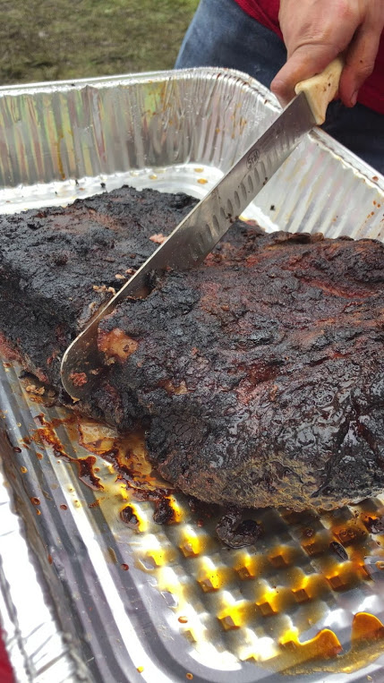 While the ribs were very large and didn’t lay out well in the pan (we used foil pans instead of the standard foam boxes due to the size), they were excellent quality plate ribs, which are meatier than the back ribs we usually use. Our ribs came out pretty good, not sure why we didn’t score better. I can only theorize that in Texas they like their ribs a little less sweet than we make them.